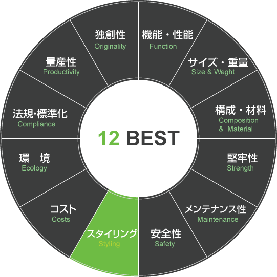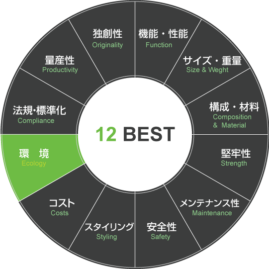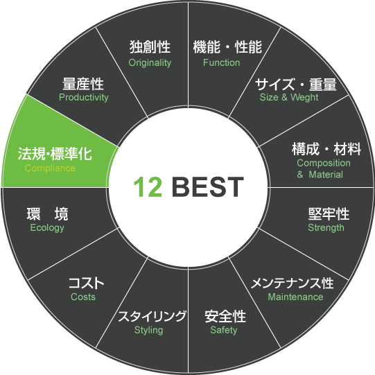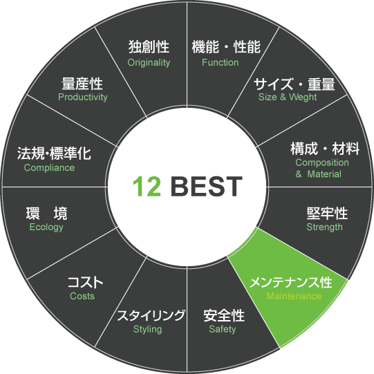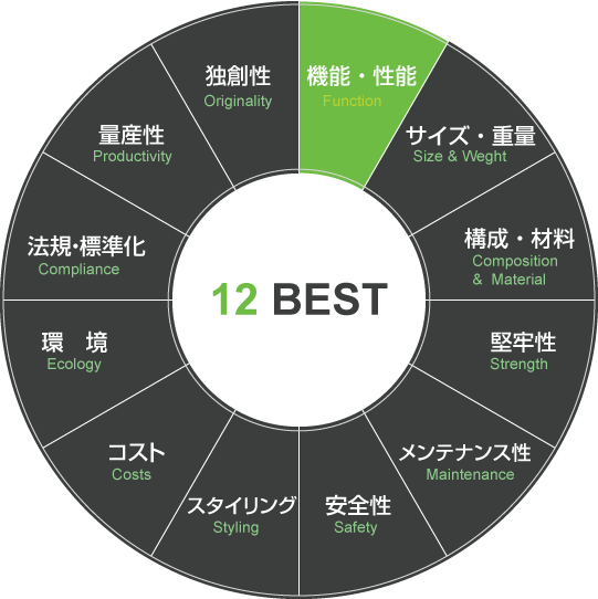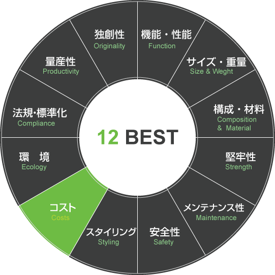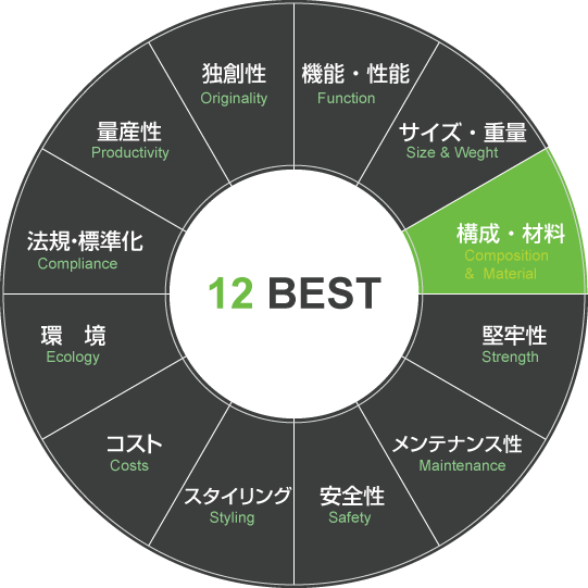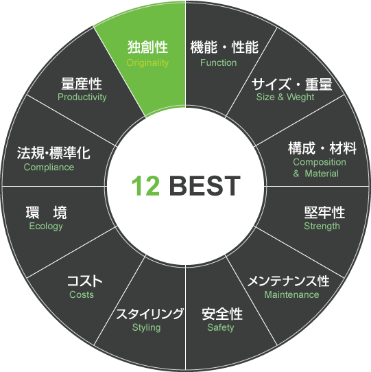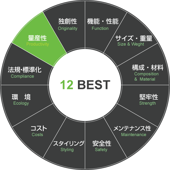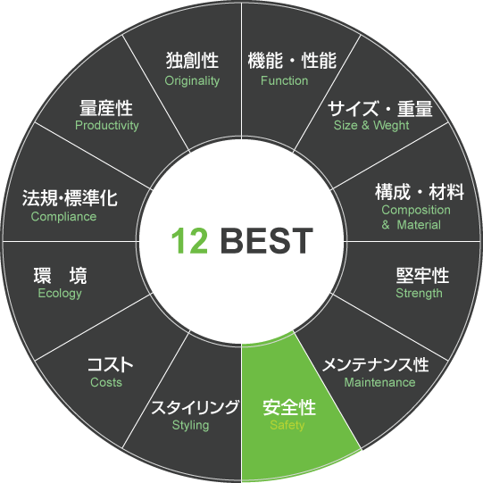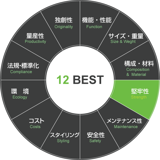 本要件「12BEST」には堅牢性、安全性、コスト、量産性など製品作りに必要な12の要素が入っており